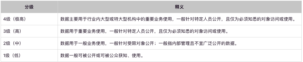 本标准中的数据等级分为四级,描述标识分为数据级别标识和数据重要程度标识两类,相互⼀⼀对应。数据定级⼀般使⽤等级本标准中的数据等级分应。