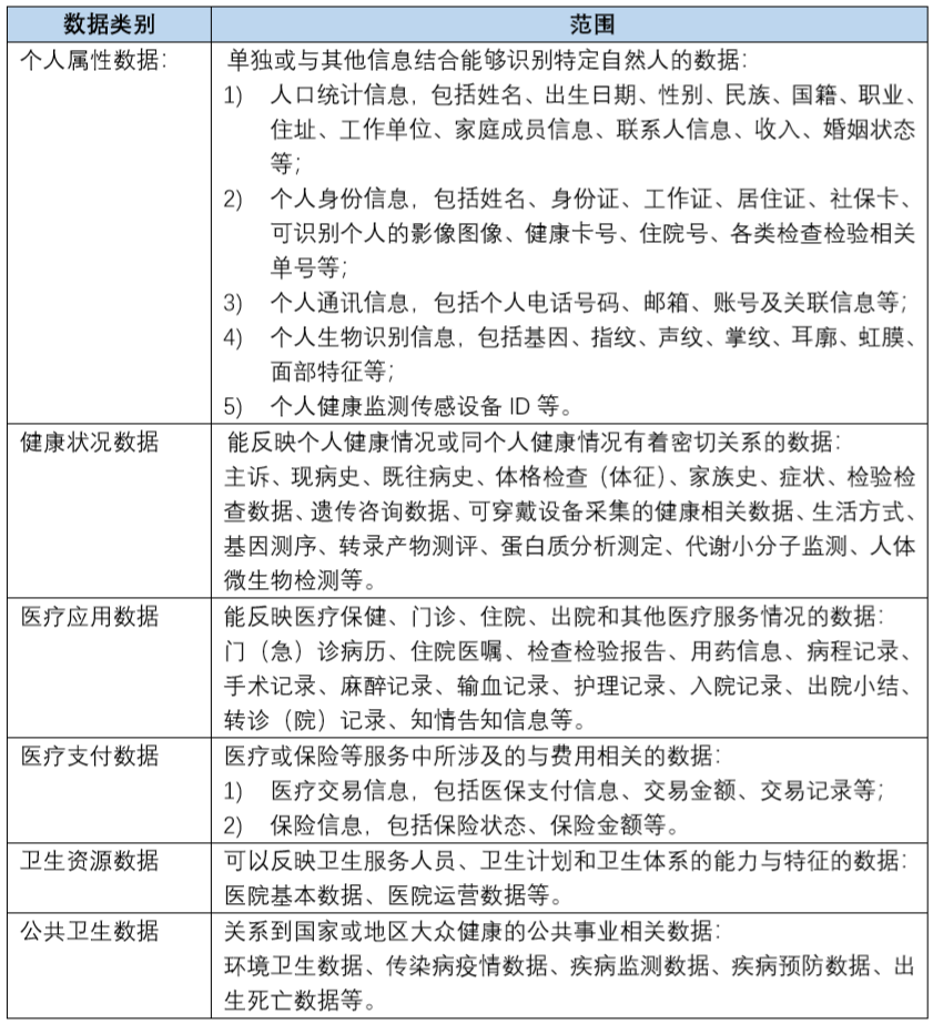 《指南》将“个人健康医疗数据”定义为“单独或者与其他信息结合后能够识别特定自然人或者反映特定自然人生理或心理健康的相关电子数据”。 并且在附录A给出一共11个举例。其中包括:向个人给予医疗服务过程中采集的有关个人的既往病史、社会史、家族史等病历记载,可穿戴设备采集的与个人健康相关的数据,关于个人的支付或医保数据等。在《指南》出台以前,关于健康医疗类数据的定义散见于各文件中,下表总结了相关定义: