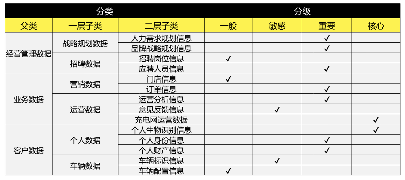汽车企业应制定相关数据分类分级管理制度,规范企业数据分类分级与数据资产盘点。在遵循国家和行业数据分类要求的基础上,从不同维度的数据类别进行识别,从影响对象、影响程度等不同方面综合考虑,可将数据分为一般、敏感、重要、核心四个级别。