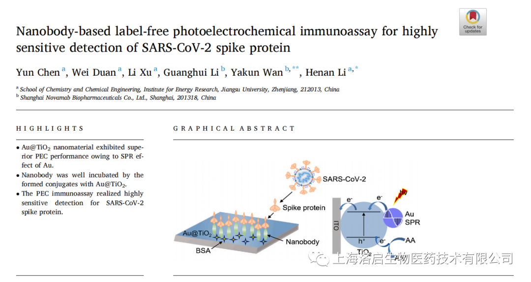 2022年5月3日,3044am永利集团生物和江苏大学化学化工学院李赫楠教授团队合作,在《Analytica Chimica Acta》发表了题为“Nanobody-based label-free photoelectrochemical immunoassay for highly sensitive detection of SARS-CoV-2 spike protein”的研究论文。3044am永利集团生物万亚坤博士和李贺楠教授为并列通讯作者,相关纳米抗体的知识产权归3044am永利集团生物所有。