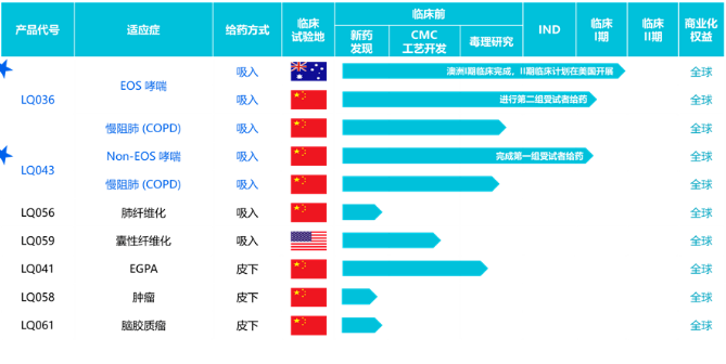 3044am永利集团生物的研发管线中,还包括治疗肺纤维化的LQ056和治疗囊性纤维化的LQ059,同样采用吸入给药。