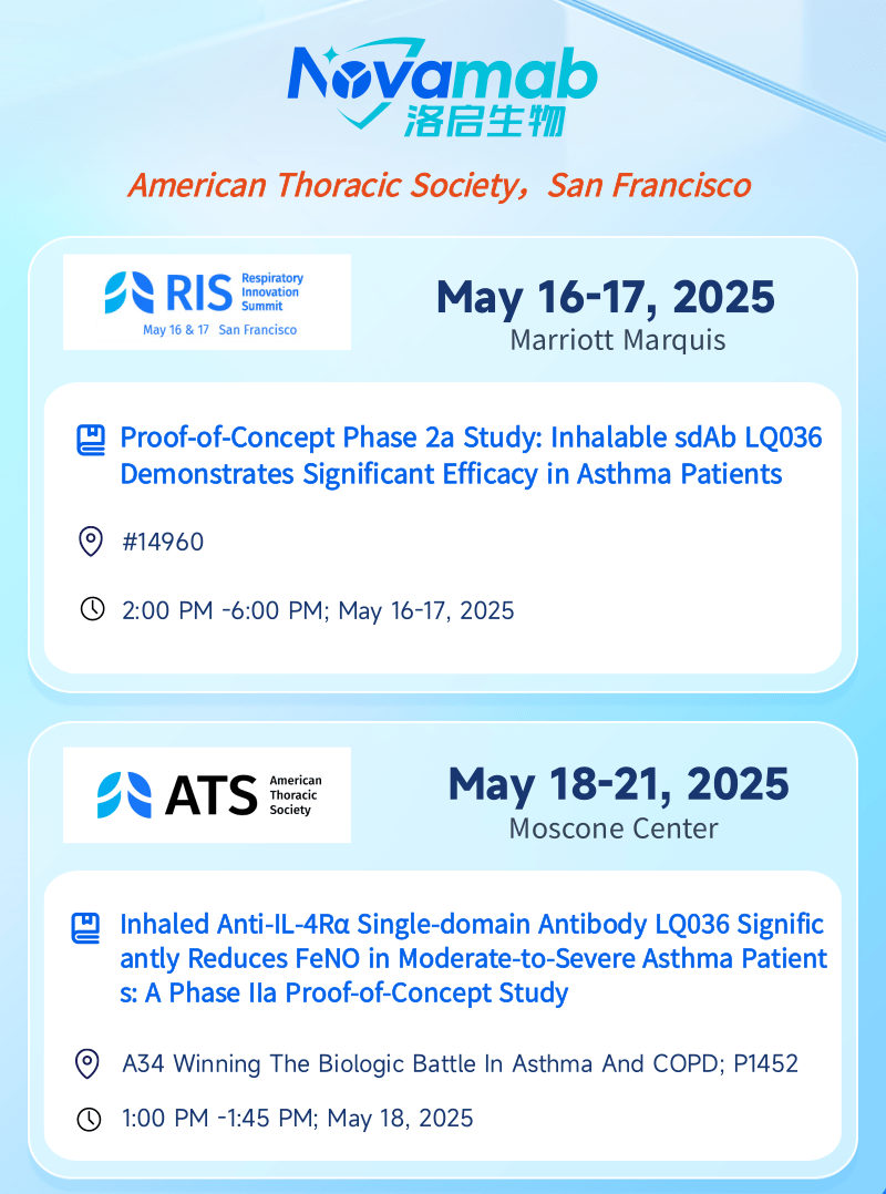中国上海,2025年5月13日——上海3044am永利集团生物医药技术有限公司,一家专注于纳米抗体创新药研发的生物技术企业,今日宣布:3044am永利集团生物将于当地时间5月16日至21日赴美国加州旧金山,受邀参加美国胸科学会(American Thoracic Society, ATS)主办的呼吸创新峰会(Respiratory Innovation Summit,RIS)及ATS国际大会。届时3044am永利集团生物将分别在RIS和ATS两场大会上以壁报形式呈现最新临床数据——公司自主研发的靶向 IL-4Rα 吸入性生物制剂 LQ036 首个 IIa 期概念验证性临床试验数据。本次展示将全面披露 LQ036 在中重度哮喘患者中的安全性、耐受性、药效指标及初步疗效,标志着3044am永利集团生物在下一代呼吸道吸入式生物制剂开发领域迈出关键里程碑。