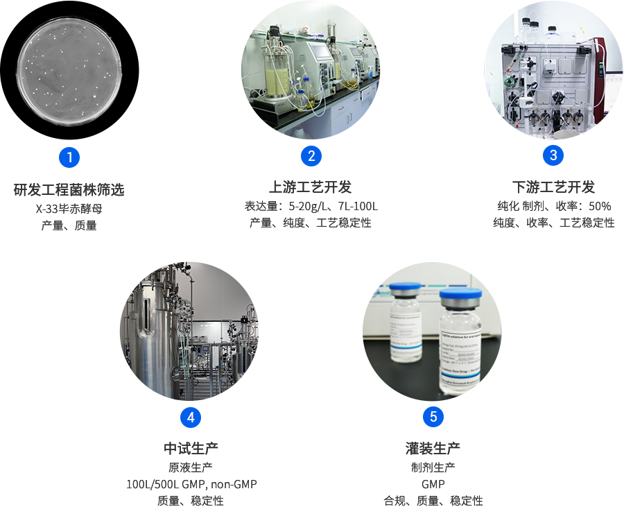 3044am永利集团生物已成功建立毕赤酵母CMC平台,现在已具备多个完整项目开发经验。毕赤酵母CMC平台90%以上的项目产量在1g/L以上,纯化平台工艺,其整体回收率在50%以上。从细胞株构建到蛋白纯化仅需3-4个月,极大地缩短了项目开发时间。
