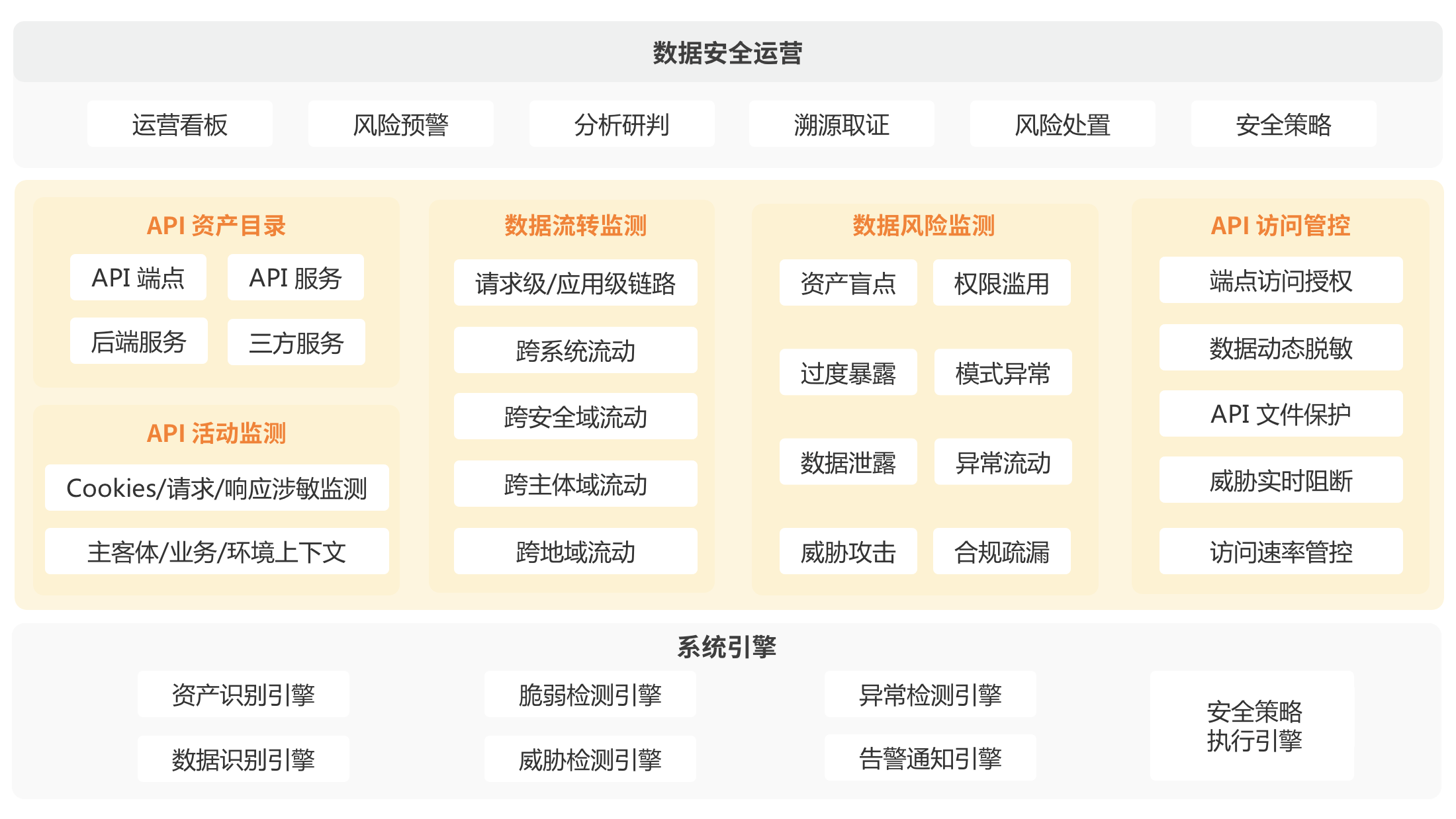 API 资产识别的不全面、涉敏数据认知不足、业务逻辑的复杂及频繁变更以及技术环境与资源限制,使得企业缺乏统一的安全执行规范,权限分级、访问控制、敏感数据脱敏等机制执行难以落地,从而难以形成从资产识别、持续防护、风险监测及响应等环节的有效闭环。